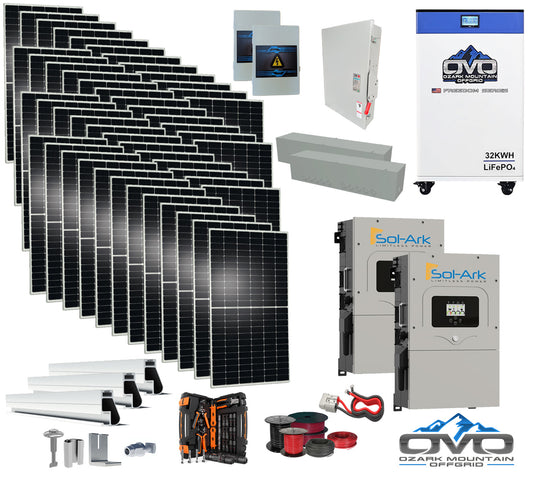 25KW Complete Offgrid Solar Kit - 32kWh OMO 48V Freedom Series Lithium Battery + 2x 15K Sol-Ark Inverter +26.4KW Solar with Mounting Rails and WiringThis Package is a great package for a Complete O...