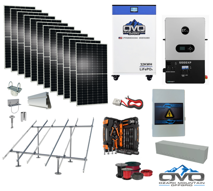 6KW Complete Offgrid Solar Kit + EG4 12K Inverter + 32KW OMO 48V Freedom Series Lithium Battery + 6.6KW Solar with Ground Mount and WiringThis Package is a great starter package for a Complete Offg...